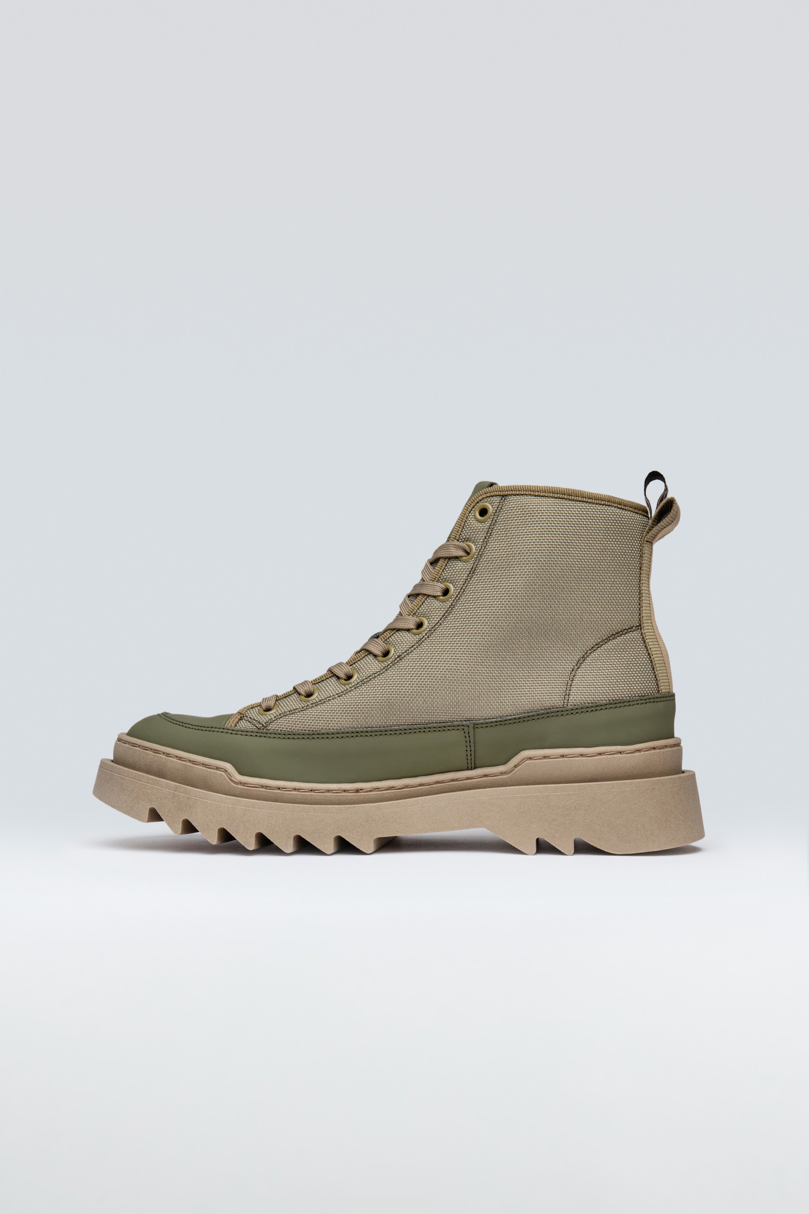 Kamiki High is a chunky high cut sneaker/boot hybrid. Crafted from a combination of rough woven nylon and leather with a polyester piping and lining in organic cotton. Made on a light, yet durable, TPR outsole.